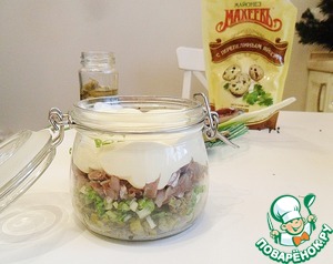 Теперь заливаем все майонезом и перемешиваем. Можно добавить немного черного перца.