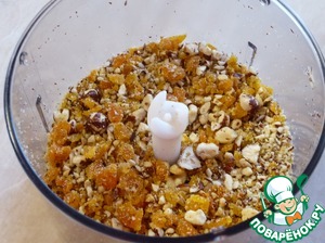 Добавить в массу перемолотые орехи с курагой, муку и замесить тесто.