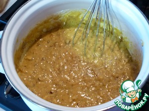 Добавить в полученную массу все наши ароматные специи и немного остудить. Вмешать при помощи венчика в массу яйца по одному.