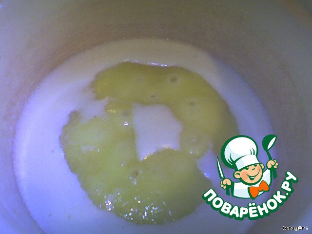 В холодное молоко добавляем взбитое яйцо, сахар, мед, масло. Довести до кипения