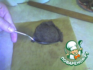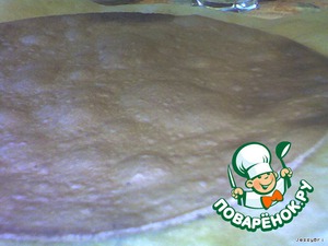 Берем по столовой ложке с верхом теста и раскатываем тонюсенькие коржи. Из этой порции получается 8-9 штук диаметром 25 см