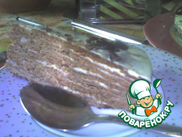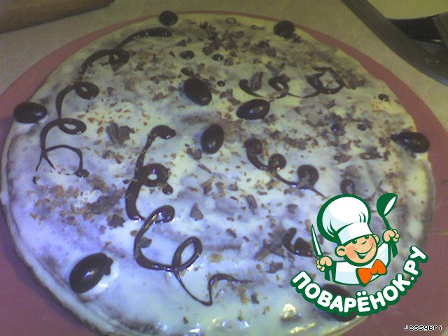 Покрывем оставшимся кремом верх и бока тортика. В оригинале готовый торт обливается шоколадом и обсыпается орехами. Но, пока я занималась кремом, стратегический запас шоколада был уничтожен :) Поэтому получилось так