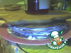 Промазываем все коржи, кроме верхнего, оставив на него и на бока немного крема. На собранный тортик кладем доску или поднос, а сверху - небольшой груз. Оставляем часа на полтора