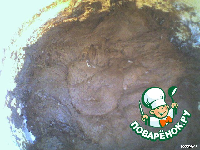Ставим на малюсенький огонь, всыпаем какао, перемешиваем, гашеную соду, перемешиваем, муку и вымешиваем тесто. Ставим на водяную баню.
