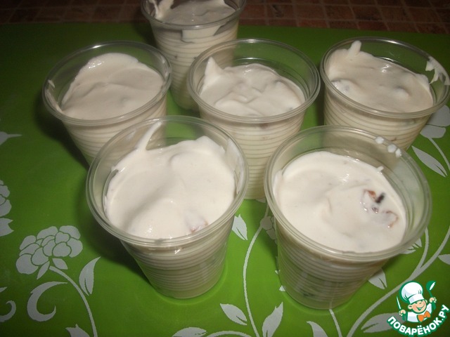 Приготовьте 7-9 одноразовых 200 мл. пластиковых стаканчиков или стаканчиков из под йогурта или тех же магазинных десертов, как у меня. Заполните их творожной массой.