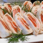 - Семга (любая малосольная красная или скумбрия копченая/соленая или копченая сельдь (в рулетики)) — 200 г