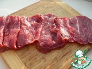 Разрезаем мясо приблизительно в 0,7-1 см толщиной, получается вот такой пласт.