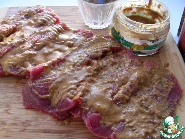 Смазываем мясо любой готовой горчицей и специями (любыми, какие есть под рукой).