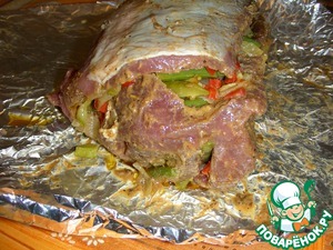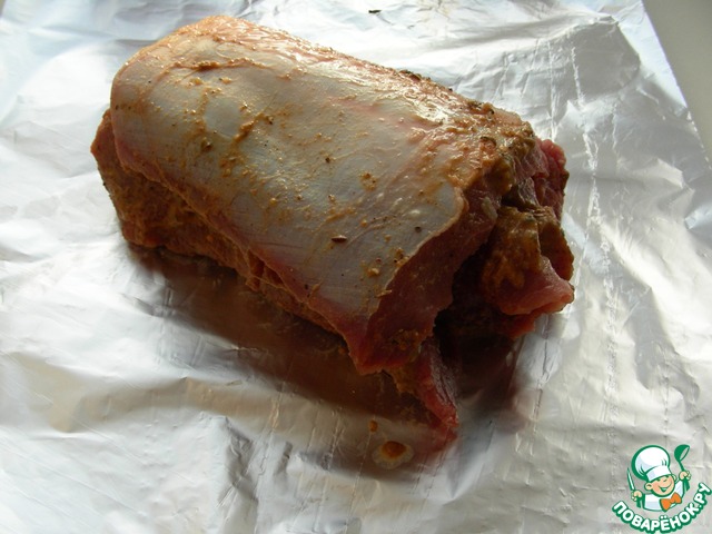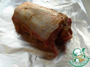 Выкладываем мясо на лист фольги и сворачиваем в рулет.