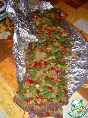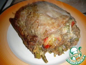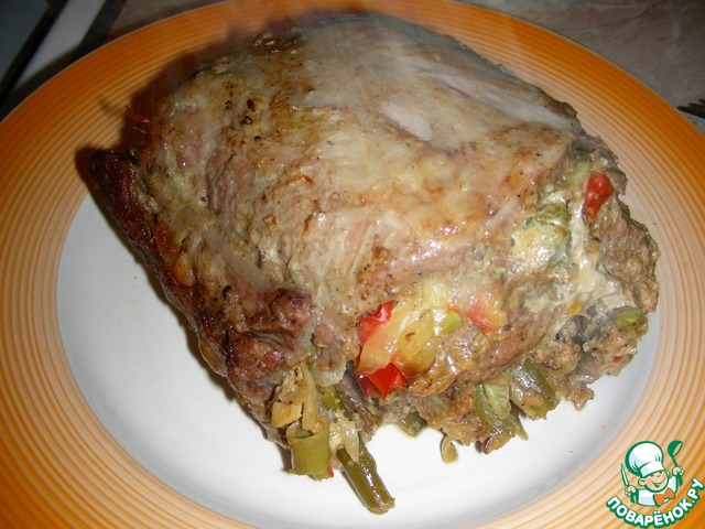 Разворачиваем мясо и выкладываем тушёные овощи.