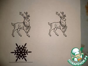 Выберете рисунки снежинки и оленя в интернете, распечатайте на листе ( я сделала 4 снежинки и 3 оленя для подстраховки, вдруг, при снятии с бумаги шоколадной фигурки, какой-то фрагмент отломается).