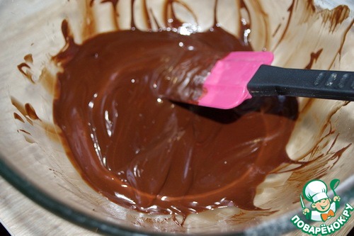 • Растопить шоколад со сливочным маслом на водяной бане, добавить коньяк и перемешать, пусть немного остынет.