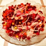 Мой винегрет смотрится празднично, в т. ч., и из-за украшения. Розочки сделаны из 2 оставшихся сырых картофелин. Картофель режется на тоненькие пластинки и замачивается в воде на 1 час. Потом он вынимается и сушится. Берем центральный «бутон» и плотно оборачиваем его одним лепестком. Затем берем другой лепесток и закручиваем его в другую сторону. После этого закрепляем бутон кусочком зубочистки. Чем большего размера вы хотите сделать «розу», тем больше используйте лепестков и скрепляющих их зубочисток. Жарим наши розы во фритюре со всех сторон до золотистого цвета. Когда «роза» приобретет поджаристый цвет – она готова. Остужаем на тарелочке, вынимаем зубочистки и украшаем винегрет.