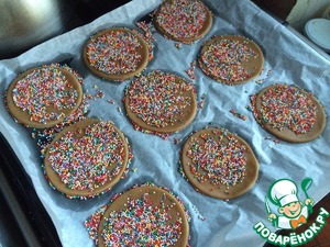 Часть печенья можно украсить радужной посыпкой, вдавив шарики в заготовки при помощи стакана.