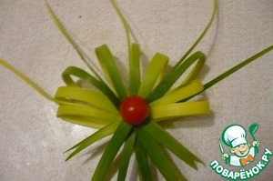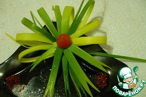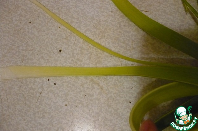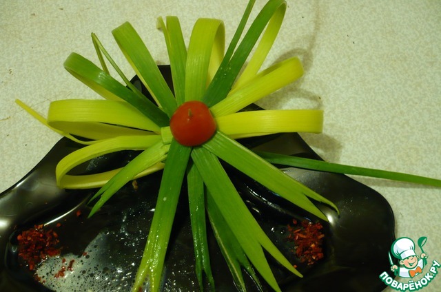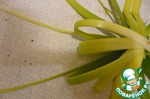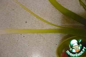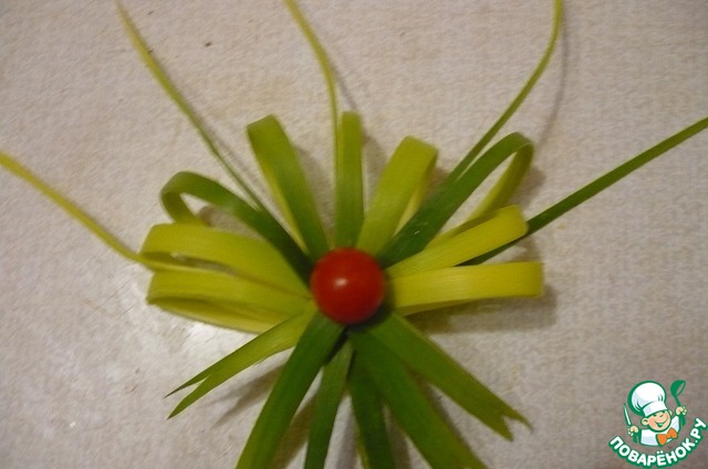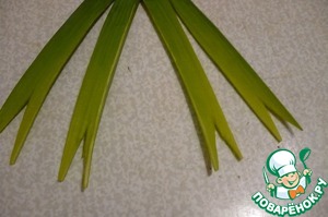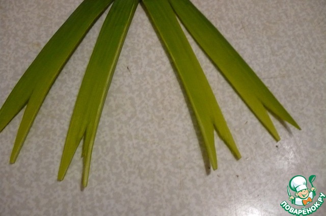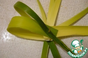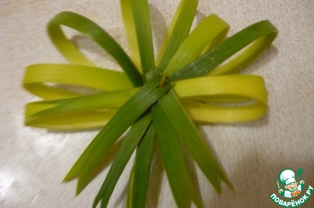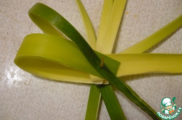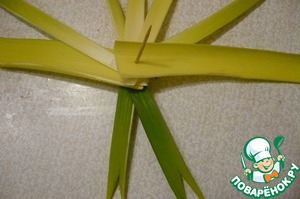 Теперь бант. Лук-порей порезать на неширокие ленточки. И нанизать на зубочистки по порядку. Одну оставить, она нам еще понадобится.