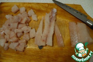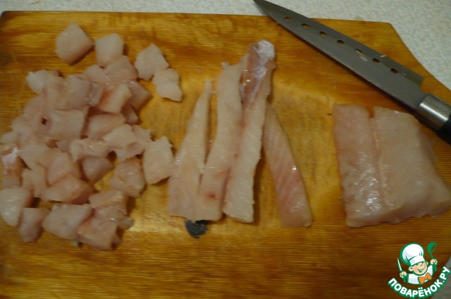 Размороженный окунь почистить, профилировать, снять кожу и нарезать мелким кубиком.