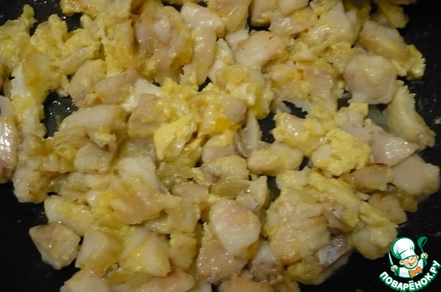 Посолить и добавить яйцо. Перемешать и, как только яйцо сварится, снять. Не мешайте очень рьяно. Нам нужно, чтобы кусочки остались целыми, а не превратились в фарш.