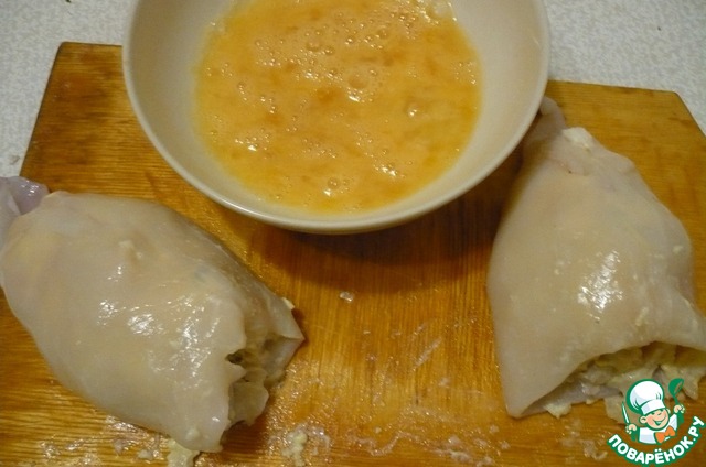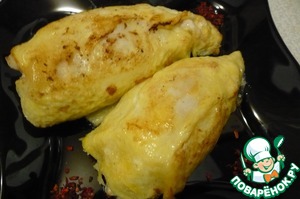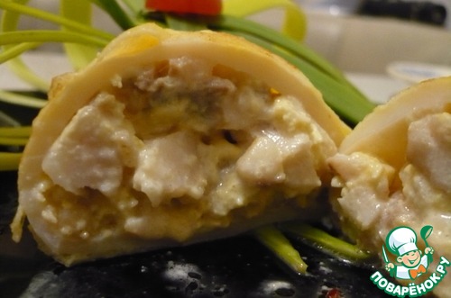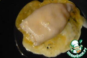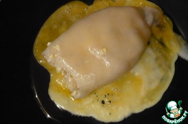 Как только яйцо схватилось и стало плотным, кальмар перевернуть. То есть яйцо должно быть на кальмаре сверху.
