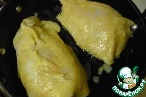 На сковороду налить половину омлета (1 яйцо). И сразу кладем кальмар. Лучше брать чугунную сковородку.