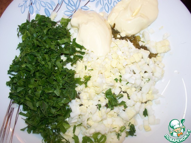 Огурец, яйца и зелень (зелень не жалейте, от ее свежего вкуса бутерброды только выиграют) мелко нарезаем и соединяем с майонезом. По вкусу солим и перчим.