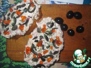 Маслины нарезать, украсить ими канапе, посыпать измельченной зеленью