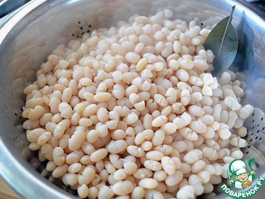 Набухшую фасоль промойте, переложите в кастрюлю, добавьте 1 литр воды, лавровый лист и щепотку соли. Варите фасоль до мягкости не менее часа.