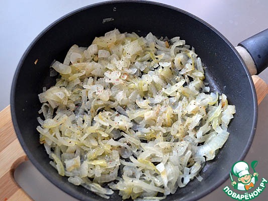Разогрейте масло в сковороде. Лук посолите, добавьте немного перца и обжарьте на среднем огне в течение 5 минут. -