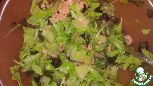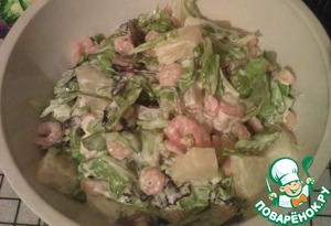 • Добавляем майонез. В этот салат лучше класть майонез с лимонным соком - он отлично подчеркнёт вкус креветок и салата и не перебьёт вкус ананаса)