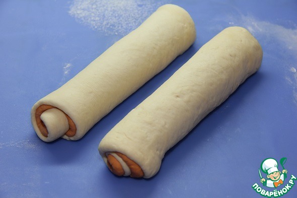 Длина рулета должна соответствовать форме для выпечки хлеба. То же самое проделать с двумя оставшимися кусочками теста.