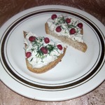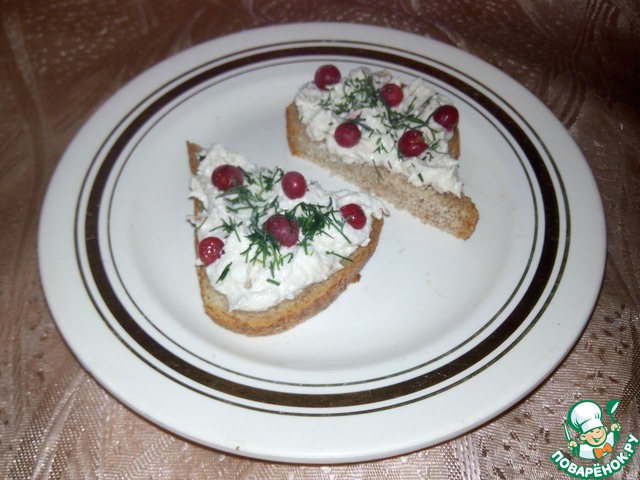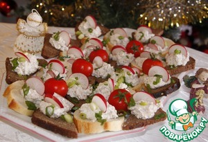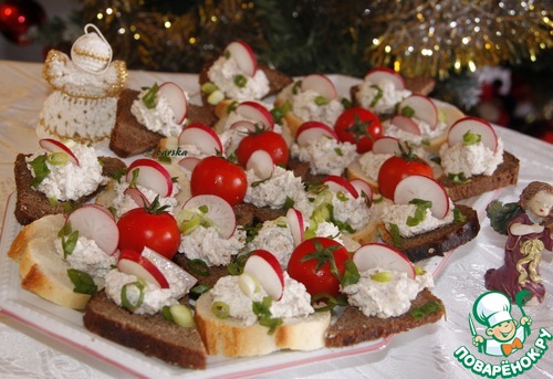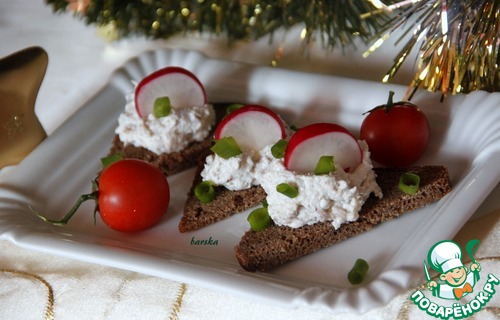 Подавать на тонких ломтиках хлеба с контрастными овощами. Можно использовать колечки маслин, но я выбрала редис и зелёный лук.