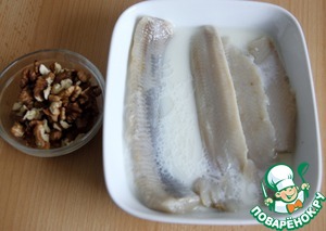 Сельдь разобрать на филе (у меня покупное филе в масле) и замочить в молоке на 1-2 часа.