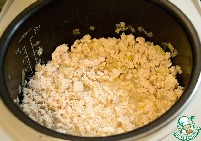 Добавить фарш, обжарить. Можно добавить немного воды и с помощью лопатки разбить кусочки, чтобы фарш был рассыпчатым. Посолить.
