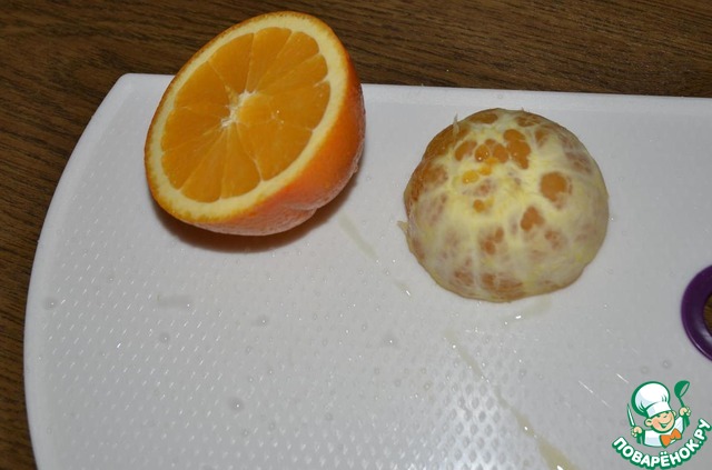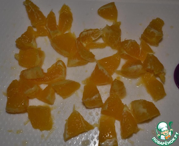 2. Апельсин помыть, разрезать пополам. Одну часть очистить от кожуры, разделить на дольки и разрезать на небольшие (порционные) кусочки (около 1-1,5 см)