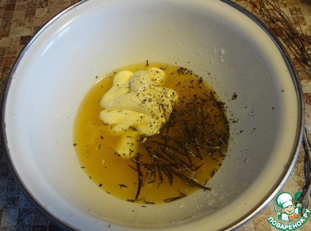 Смешаем апельсиновый сок, добавим коньяк, оборвём листочки с розмарина и тимьяна, пропустим через пресс чеснок. Посолим и поперчим по вкусу. Добавим майонез "Махеевъ" "Оливковый". -