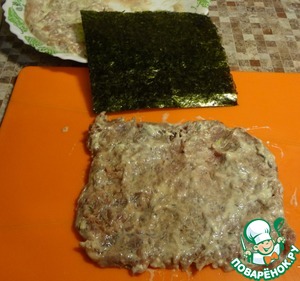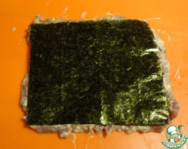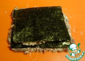 Когда мясо замаринуется, положим первый слой - говядину. Вырежем по этому размеру из листа нори кусочек...