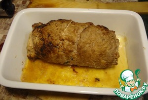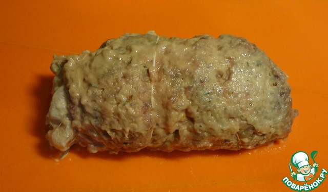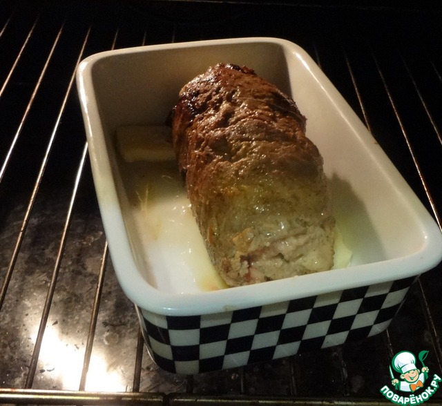 Положим рулет в жаропрочную форму и поставим в духовку минут на 15, чтобы мясо в середине было готово.