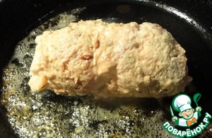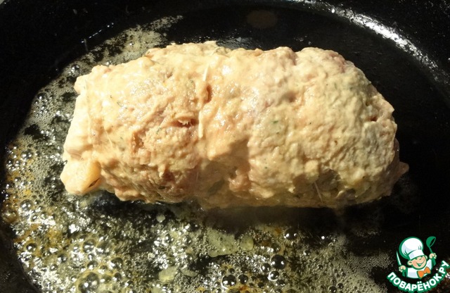 На сковороде разогреем растительное и сливочное масло. Обжарим рулет со всех сторон.