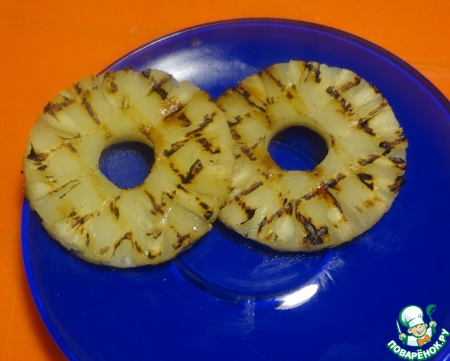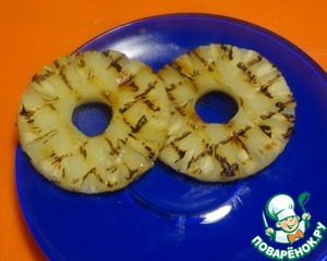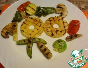 На тарелку выложить обжаренные на гриле овощи. На ананасы поставим наш рулет, который надо разрезать пополам наискосок.