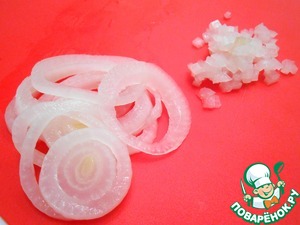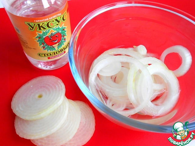 Замаринуем лук. Для этого нарежем лук кольцами (или полукольцами) и зальем водой с уксусом в соотношении 1:1. Оставим на некоторое время.