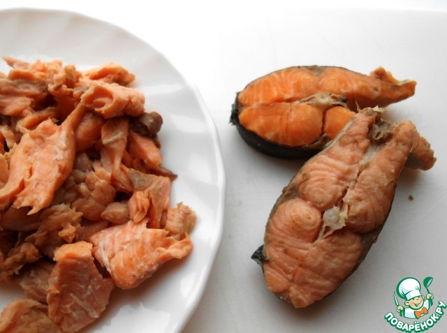 Отварную рыбу отделим от костей и разомнем вилкой. Не нужно измельчать блендером, это не паштет; все ингредиенты режем ножом.
