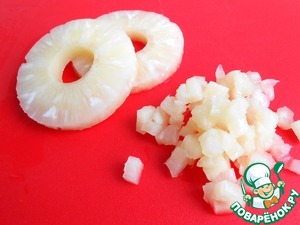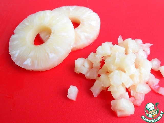 Соединяем ингредиенты. Для 1-ой закуски: половина от всего количества рыбы, половина лука, ананас.