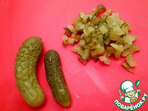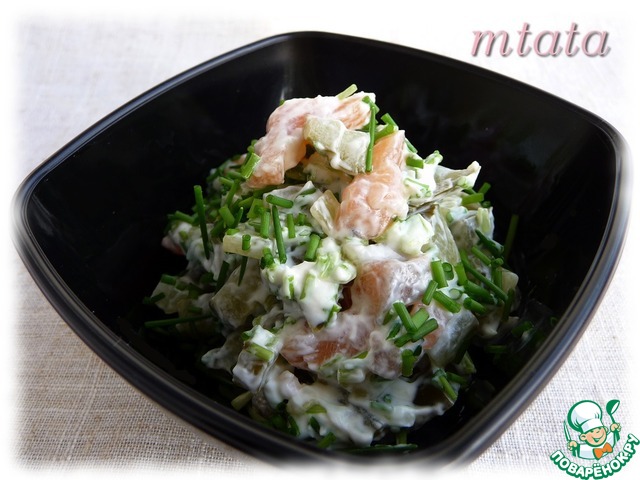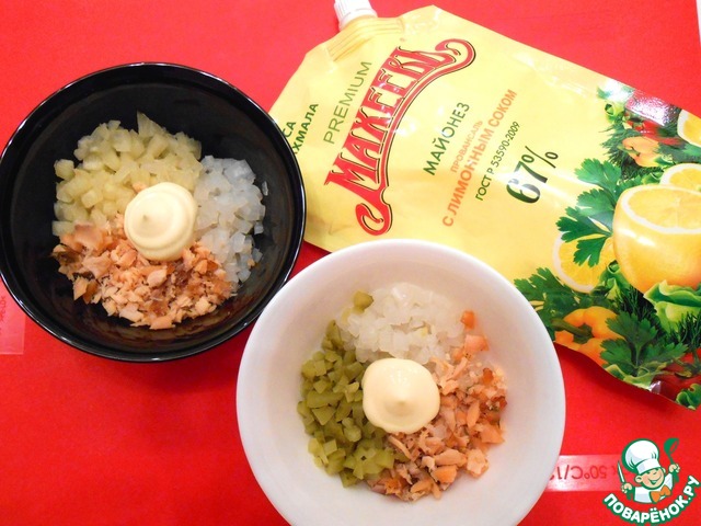 2-я закуска: рыба, лук, огурец. Заправляем майонезом. -