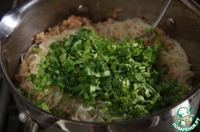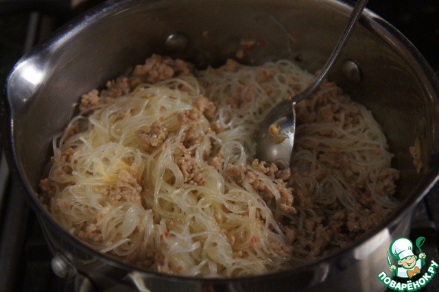• В большой сковороде (идеально - в воке) разогреть кунжутное (в крайнем случае, ароматное подсолнечное или горчичное) масло, влить соевый соус, добавить имбирь, перец и кунжутные семечки, прогревать 30 секунд. Затем добавить фарш и обжаривать его в течение 3-4 минут, разминая комки вилкой или толкушкой для картофеля. Затем влить 2 половника горячего бульона. Готовить на маленьком огне 7-9 минут.