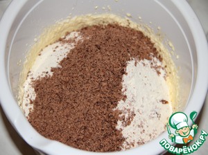 Взбить миксером маргарин с сахаром. Не прекращая взбивать, яйца добавить по одному. Добавить в тесто муку и 1/2 шоколада, взбить.