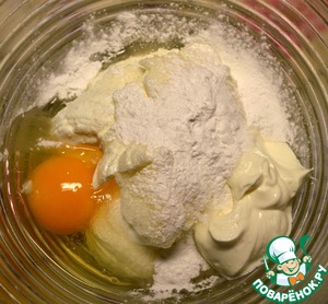 Творог смешать со сметаной, крахмалом, сахаром, ванильным сахаром, яйцом и хорошо взбить миксером на небольшой скорости. -