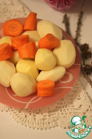 Картофель и морковь очистить, нарезать некрупными кусочками и отварить в подсоленной воде до готовности.