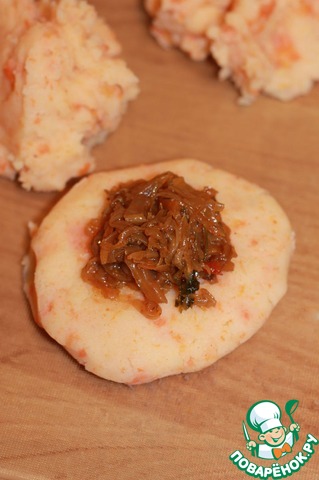 Из каждой части картофельной массы сделать лепешку, положить немного тушеной капусты (солянки)