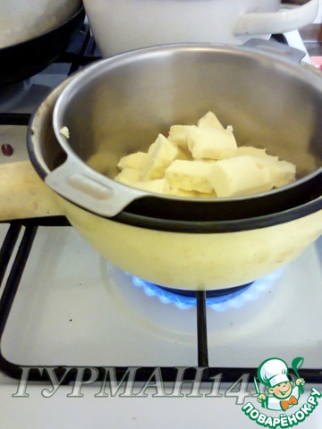 57. Расплавляю белый шоколад. Растапливаем шоколад на водяной бане, вода не должна касаться емкости, в которой находится шоколад. Постоянно мешаем шоколад и снимаем периодически с огня.