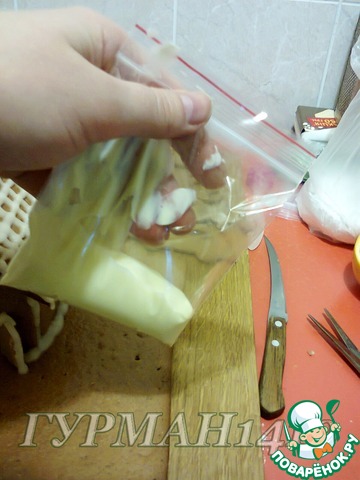 54. Накладываем глазурь в корнетик (кулечек), отрезаем немножко кончик, и выдавливаем глазурь.