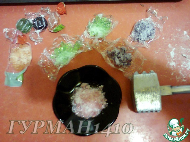42. Конфеты, не разворачивая, бьем молотком. После этого развернуть – карамельная крошка готова